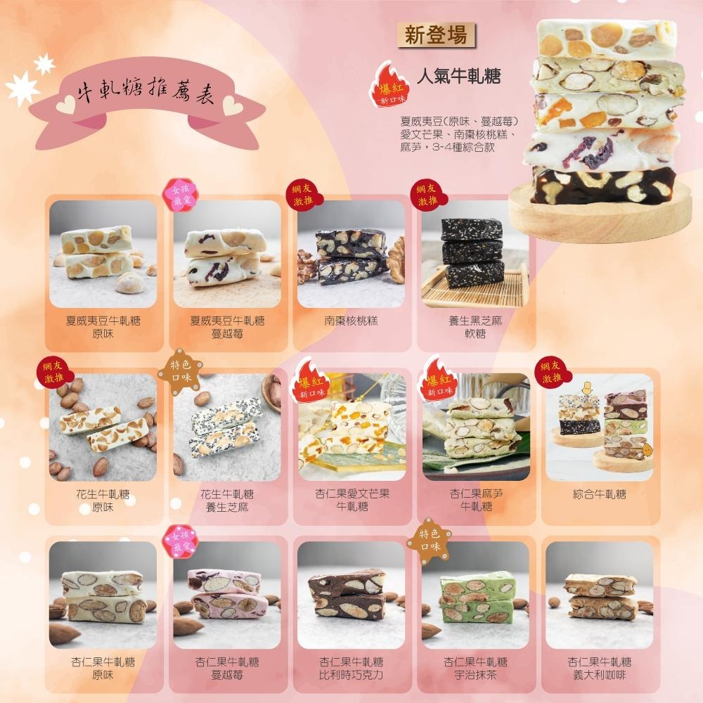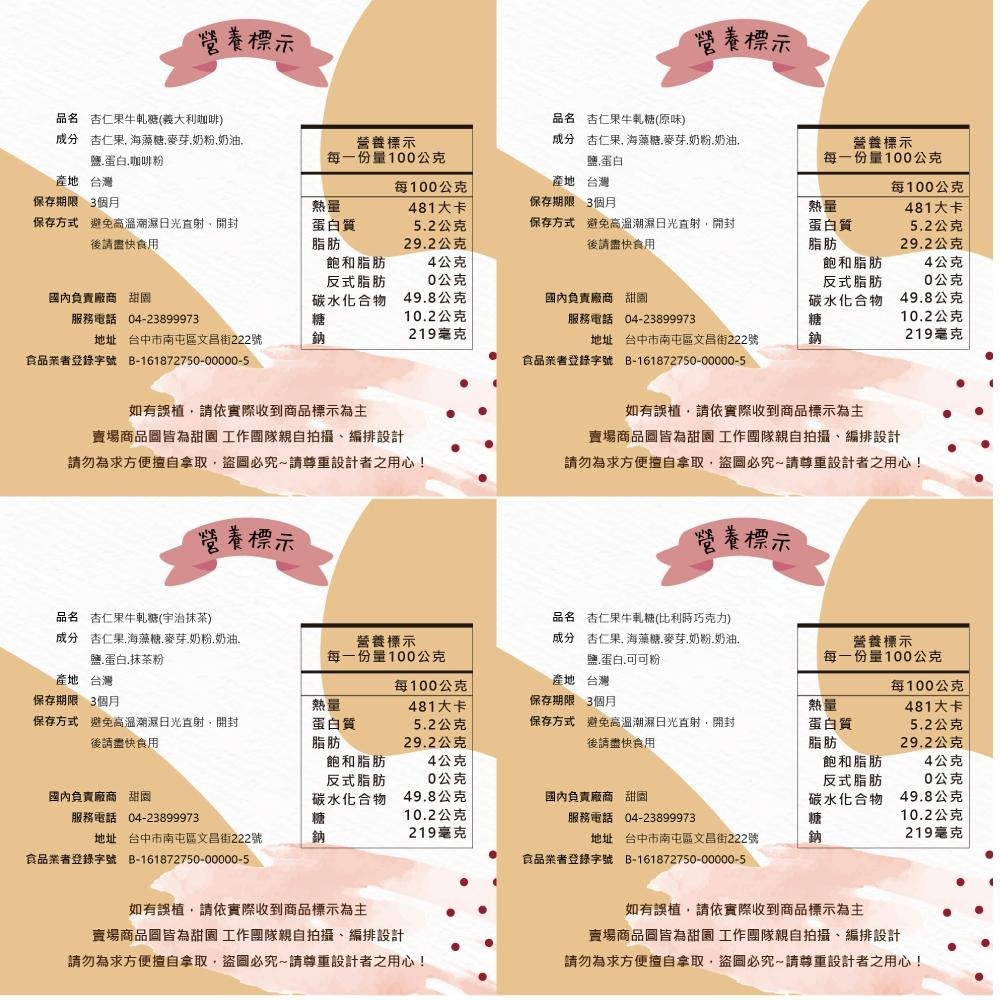 👉過年禮盒12盒以上購買有93折優惠還加贈1盒(以價低者計算),詳情請與我們聯絡! 🔔禮盒超商:小資禮盒僅限13盒,圓滿禮盒僅限3盒,超過數量請使用宅配!! 若需禮盒外加其他商品請私訊小幫手為您解答~~ 🔔禮盒有新舊包裝款,款式將會隨機出貨~~ 產品名稱 ► 法式 純手工牛軋糖 杏仁果牛軋糖 / 花生牛軋糖 袋裝 產品規格 ► 200g(約19-20個不等) (實際數量以內容物為主) ✠花生牛軋糖 200g(約19-20個不等) 原味口味、 養生芝麻口味 ✠杏仁果牛軋糖 200g(約19-20個不等) 原味口味、宇治抹茶口味、義大利咖啡口味、美國蔓越莓口味、比利時巧克力口味 ✠✠綜合牛軋糖:杏仁果(5種口味)+花生(2種口味)+黑芝麻軟糖 混搭款 隨機5-8種口味出貨 (此款180g/包) 保存期限 ► 3個月 產品說明 ► ★★純手工製作 ★使用加州杏仁果及台灣花生 ★搭配搭配濃、純、香之新鮮牛乳! ★以海藻糖替代了砂糖,甜度大為降低! ★獨一無二之高營養、無負擔的頂級茶點! ★全新素材搭配,堅持完整製程的古法傳承 產地 ►台灣 備註 ► ☑️食品類因安全衛生考量,故拆封過後皆不退換貨,敬請見諒! ☑️ 開封後容易受潮,請密封放置於陰涼處,並儘早食用完畢。 ☑️ 商品運送中難免會碰撞、凹痕及破碎等輕微情況,介意者請勿下標。 ☑️ 天氣炎熱,軟糖、巧克力等商品會因氣溫而導致融化、變形, 建議您可冷藏後食用,商品一樣美味,如果還是介意者請勿下標。 ☑️ 進口商品會不定期更換包裝,請以實際收到商品為主。 ☑️部分蜜餞類、水果乾及餅乾糖果等商品採用食品級夾練袋包裝,避免一次性食用不完的情形。 **資訊如有誤植,請以收到的實際商品為主。** 廠商住址 ► 台中市南屯區文昌街222號 廠商電話 ► 04-2389-9973 食品業者登入字號 ► B-161872750-00000-5 產品責任險 ► 國泰產險 保險單號碼 1502字 08PD04600號" 消費者收受日起算,至少距有效日期前150日以上 ⚠賣場商品圖皆為甜園 工作團隊親自拍攝、編排設計 請勿為求方便擅自拿取,盜圖必究~請尊重設計者之用心! #牛軋糖 #伴手禮 #中秋節首選 #杏仁果牛軋糖 #不黏牙 #中秋節禮盒 #年節禮盒 #蘇格蘭禮盒 #抹茶 #蔓越莓 #巧克力 #咖啡
