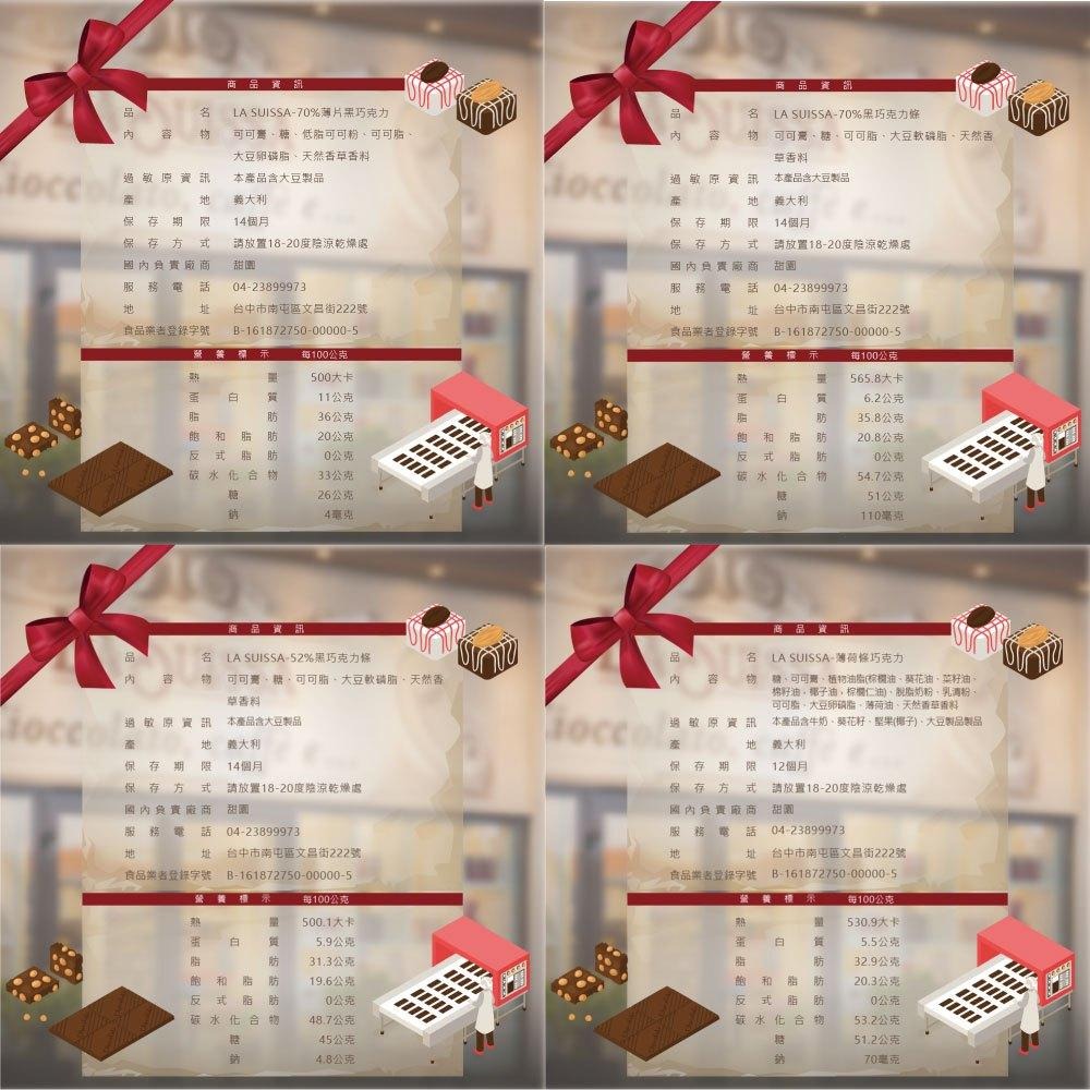 LA SUSSAI-70%黑巧克力條:每顆長度約5cm、高度約1cm、寬約1.3cm(實際數量以內容物為主)