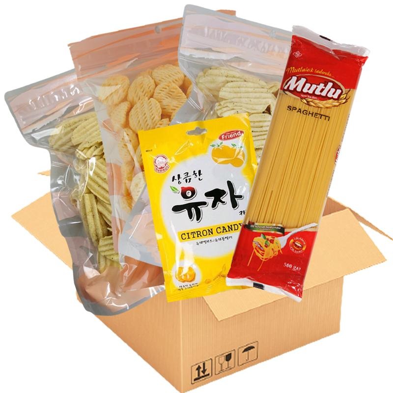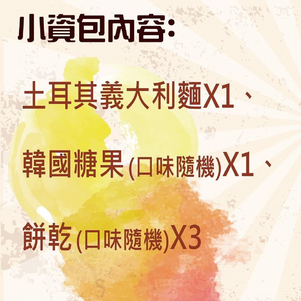 內容物:土耳其義大利麵*1、餅乾(口味隨機)*3、韓國糖果(口味隨機)*1