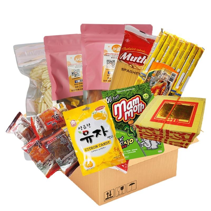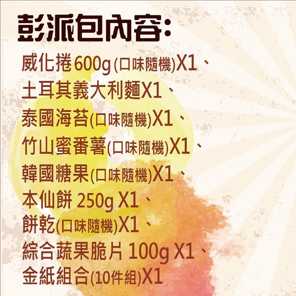 內容物:威化捲600g(口味隨機)*1、土耳其義大利麵*1、泰國海苔(口味隨機)*1、竹山蜜番薯(口味隨機)*1、