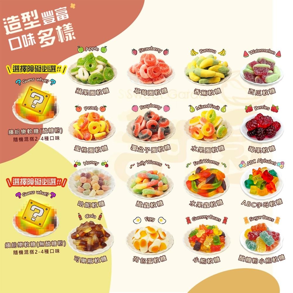 、蘋果圈軟糖、覆盆子圈軟糖、可樂瓶軟糖、荷包蛋軟糖、哈妮軟糖、草莓圈軟糖