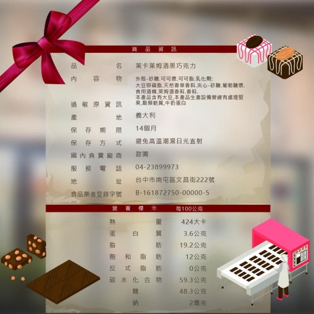 特級黑巧克力搭配萊姆酒酒夾心,濃醇香的口感~
